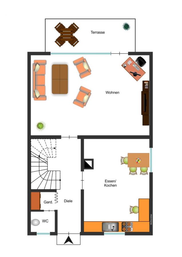 Eine Metalltreppe mit Holzstufen verbindet die Etagen. Das ausgebaute Dachgeschoss ist in der angegebenen Wohnfläche nicht berücksichtigt und bietet zusätzliche Nutzfläche.