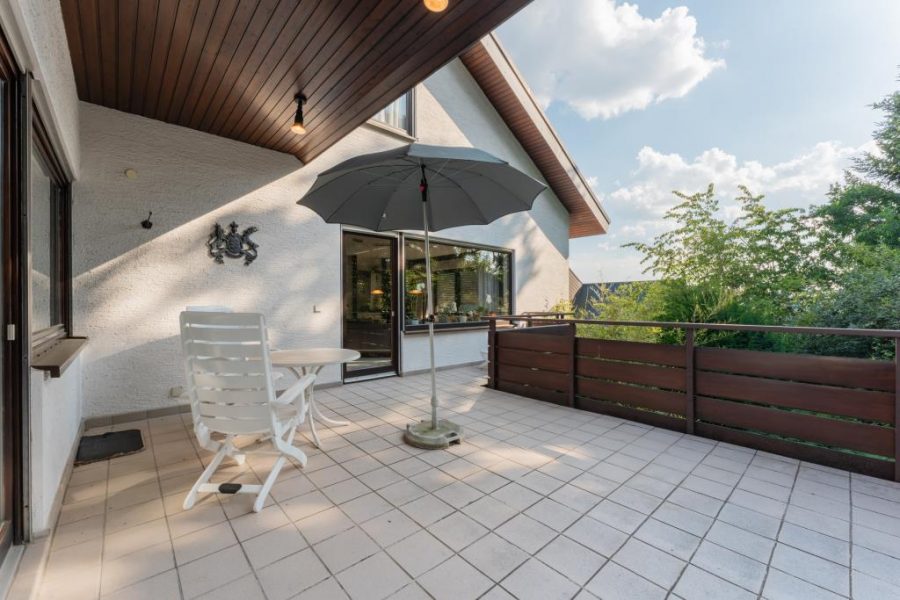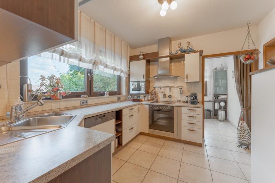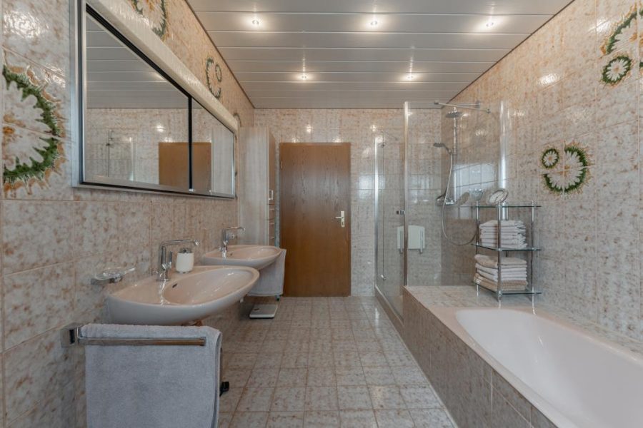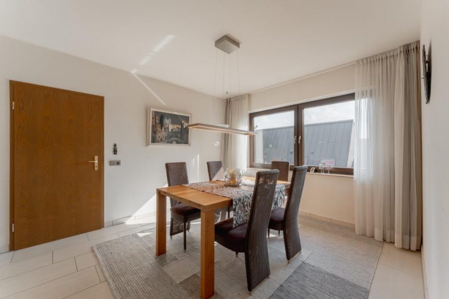 Das Tageslichtbad ist ausgestattet mit Badewanne, Dusche und Kabine, WC sowie zwei Waschbecken. Die Küche ist funktional gestaltet und wird ergänzt durch einen Hausarbeitsraum und ein separates Esszimmer.