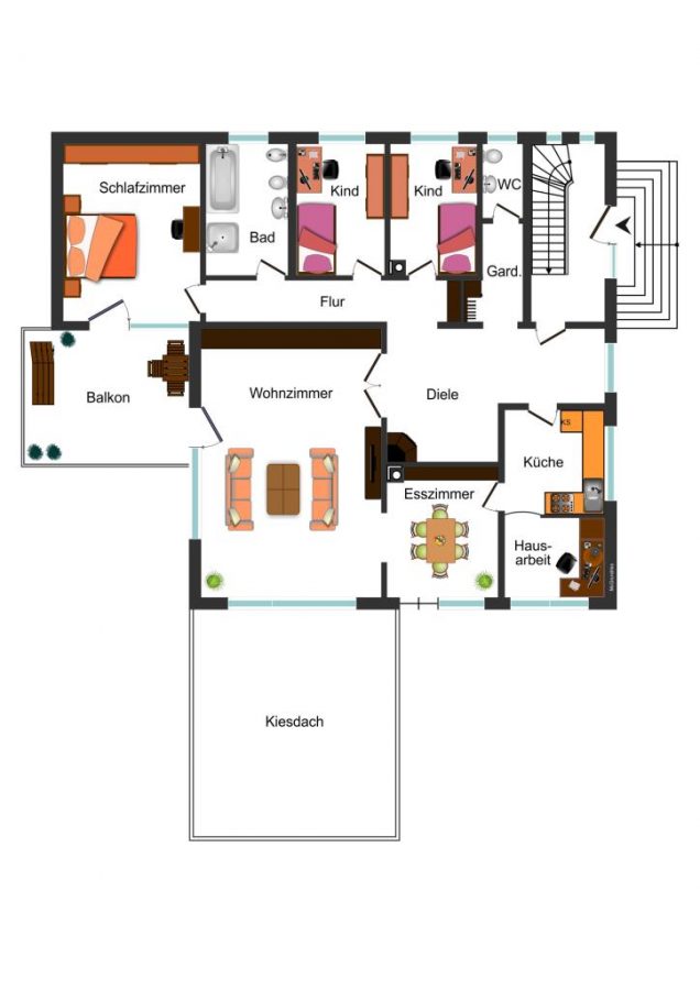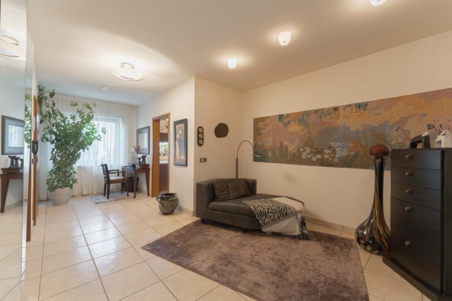 Über den überdachten Eingangsbereich mit Treppenverbindung ins Dach- und Gartengeschoss betreten Sie die Hauptwohnung. Die großzügige Diele mit Garderobe und Gäste-WC schafft einen einladenden Empfang.