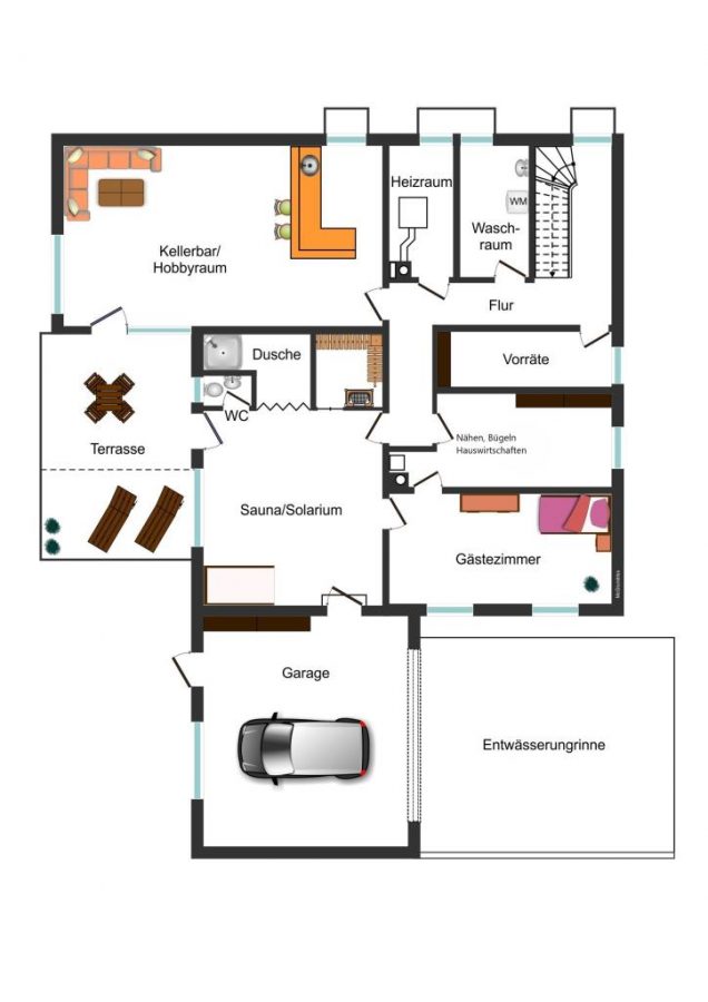 Zudem befinden sich hier eine gemütliche Kellerbar, ein Gästezimmer, ein Näh- und Bügelzimmer, ein Vorratsraum, sowie ein Wasch- und Trockenraum.