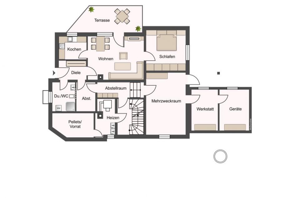 . Heizraum, Mehrzweckraum mit Gartenausgang, Abstellraum