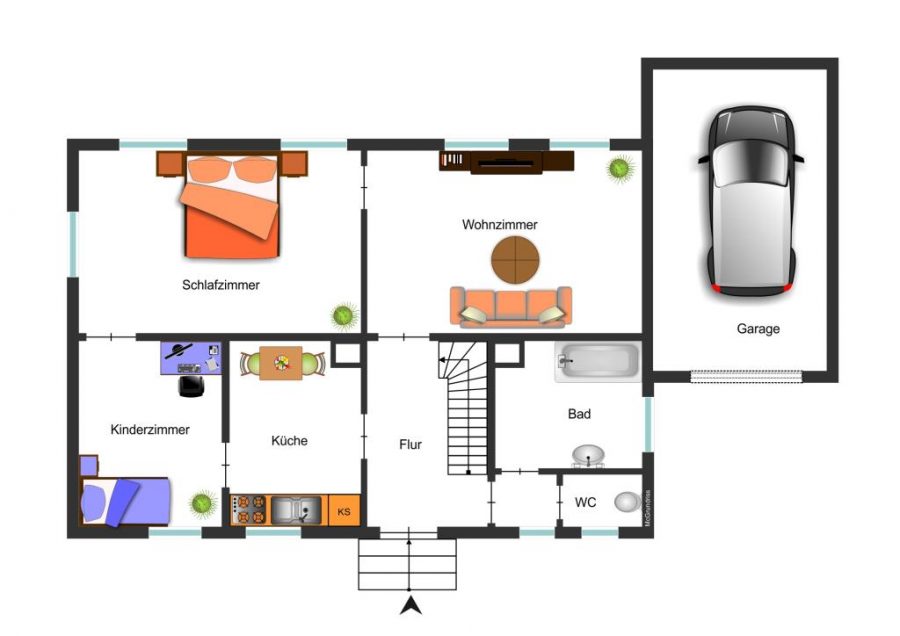 Ein besonderes Highlight ist der nach Westen ausgerichtete Garten: sonnig, weitläufig und mit vielfältigen Möglichkeiten zur individuellen Gestaltung – ob Familiengarten, Ruheoase oder moderner Außenbereich. Hier können Sie Ihren persönlichen Wohntraum verwirklichen. Eine direkt an das Haus angebaute Einzelgarage sorgt für komfortables Parken.